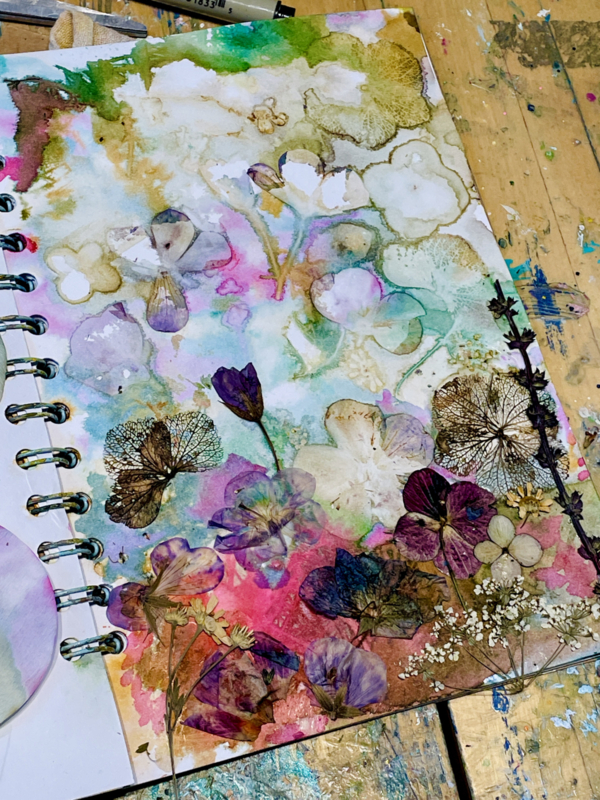 Mixed media met inkt, bloemen en bladeren