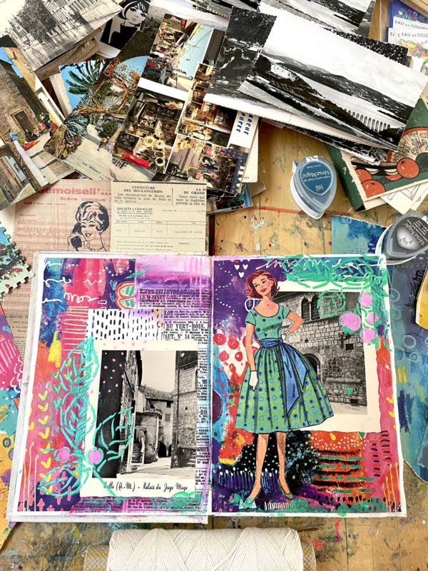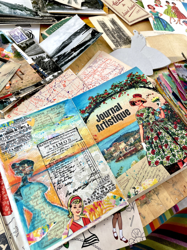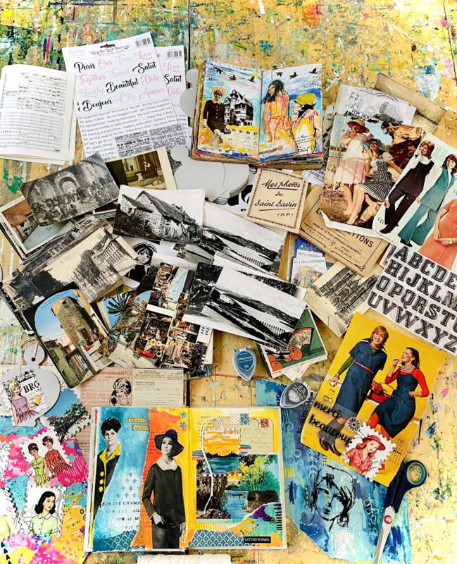 We werken met Neo Color II, een vleugje acrylverf, lijm, stencils, oude Franse ansichtkaarten, Franse stempels, Franse ephemera - oude Franse parfum labels!- oude vintage mode tijdschriften en wat nieuw papier met Frans thema. Alle materialen, inclusief oud vintage Frans boekje inbegrepen. De oude ansichtkaarten zijn vooral foto's van stadjes en dorpen, ook leuk om te verwerken in je collage.